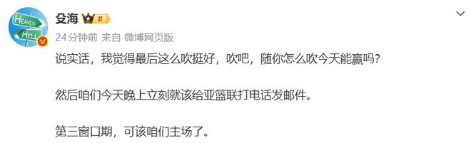 篮球解说员殳海表示:咱们今天晚上立刻就该给亚篮联打电话发邮件。第三窗口期,可该咱们主场了。