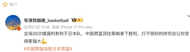 而网络上有相关的篮球博主复盘整场比赛,最终找出裁判有多达28次的错漏判,全都是有利于日本队的,如此不公平的吹罚在整个世界篮坛历史上都实属罕见。中国队主帅郭士强在赛后的发布会就强调这是一场赢得很艰难的比赛,言下之意非常清楚。好在最终中国男篮赢下比赛,没有让胜利溜走。